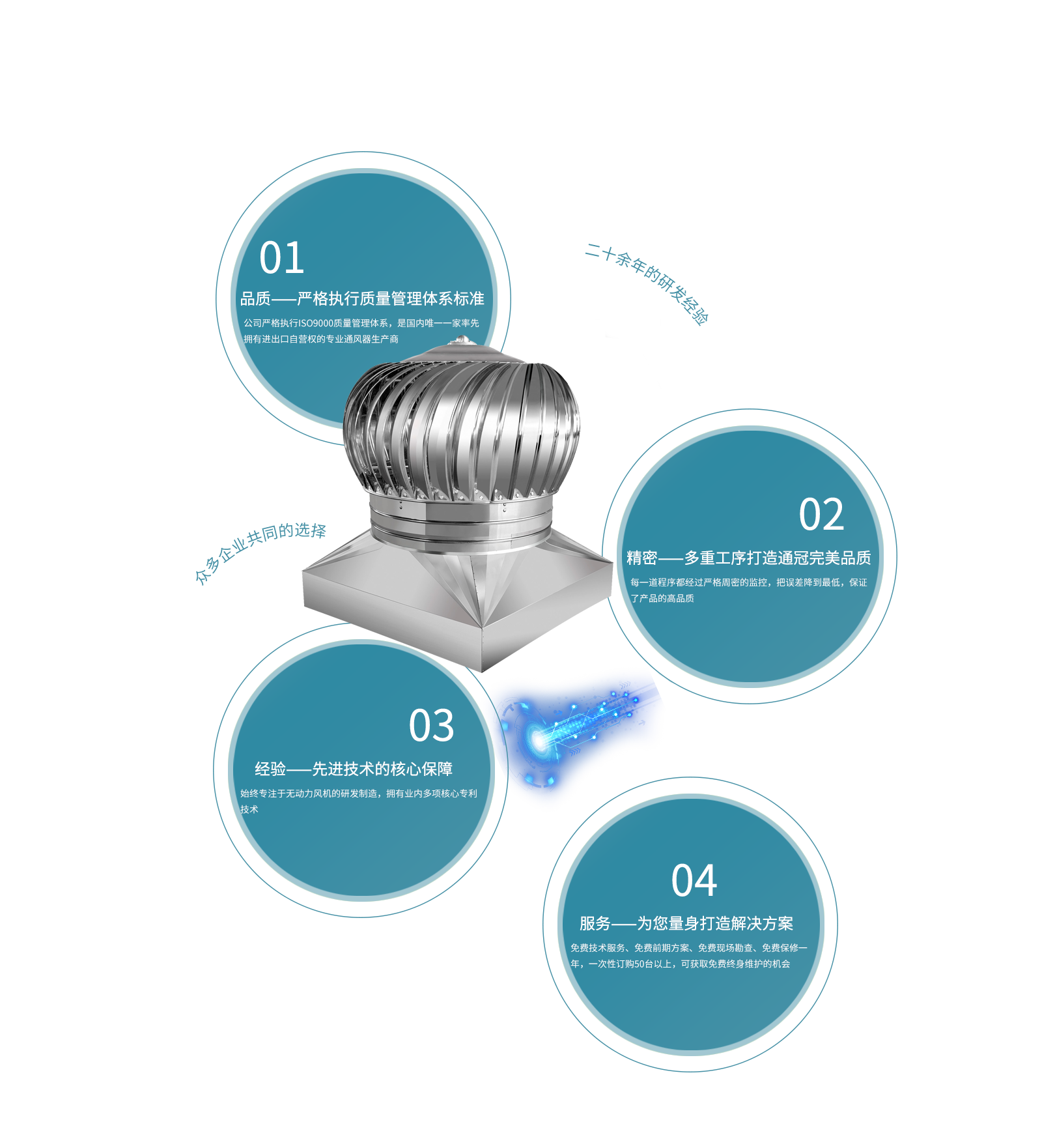 天長市通冠無動力風機有限公司,是集研發、生產、銷售于一體的,專業無動力風機生產廠家。公司坐落于205國道南京與揚州之間,位于省級高新經濟技術工業園,交通便利?!巴ü凇庇兄恢Ъ夹g精湛、服務非凡的隊伍。所有一線技術工人技術熟練、質量意識強。公司嚴格執行ISO9000質量管理體系,一貫貫徹“以質量為生命”、“以信譽為根本”、“以服務為基礎”的理念···[查看詳細]